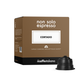 Compatibili Dolce Gusto®* Cortado: la proporzione perfetta tra caffè e latte. La bevanda Cortado in capsule Compatibili Dolce Gusto®* ha un colore ricco e scuro con una leggera schiuma sulla superficie. Il Cortado offre un sapore intenso e corposo del caffè espresso, ma la presenza del latte ne attenua l'amaro, conferendogli una dolcezza delicata e una consistenza vellutata.