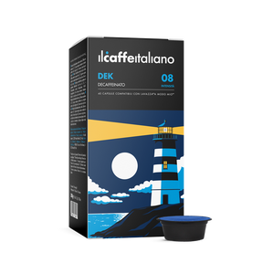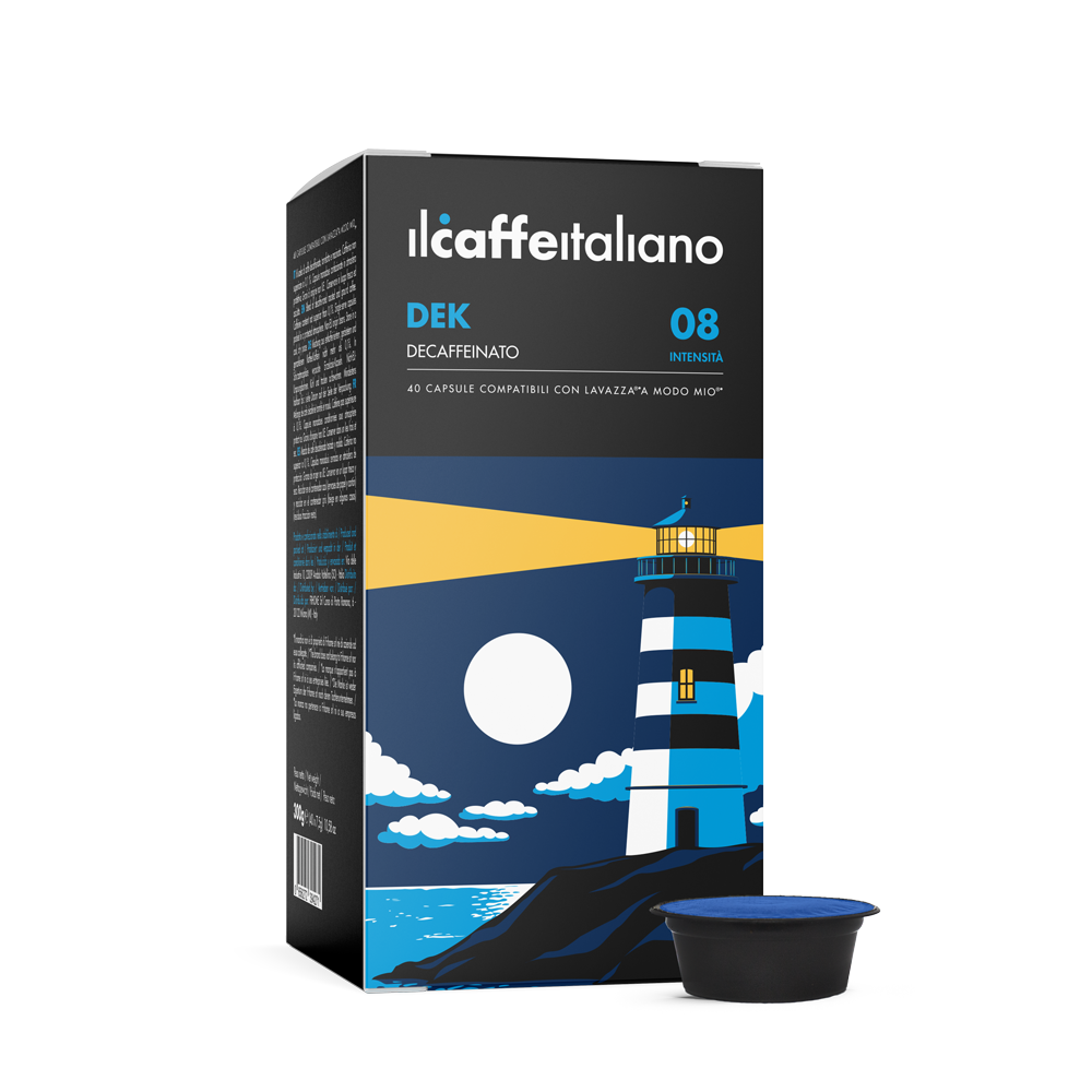 Dek in capsule compatibili Lavazza®* A Modo Mio®* è un decaffeinato senza compromessi. La tostatura lenta e scura dona un gusto forte e deciso dove si possono aprezzare piacevoli note di fava di cacao e nocciole tostate. Un espresso autentico, dove l'assenza di caffeina non attenua nessuna caratteristica gustativa.